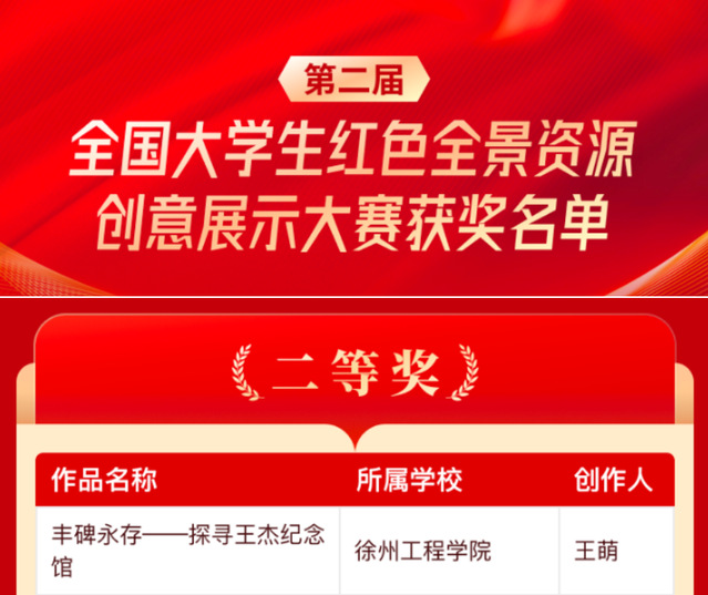 近日,第二届全国大学生红色全景资源创意展示大赛结果揭晓,我校伟德BETVLCTOR1946教师安克杰指导的实践教学作品《丰碑永存——探寻王杰纪念馆》荣获大赛二等奖。