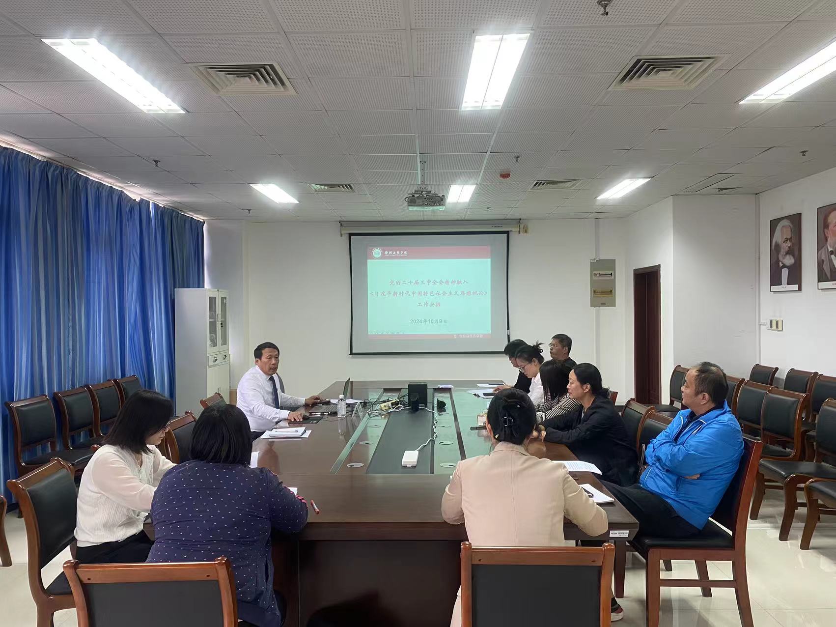 在《习近平新时代中国特色社会主义思想概论》备课会上,周海航副院长根据教育部布置的教学专题和教学要求,向与会教研室教师介绍了党的二十届三中全会精神融入《习近平新时代中国特色社会主义思想概论》课程的工作安排,针对相关章节做了全面、细致的讲解和授课辅导,参会教师就相关知识重难点进行深入的交流和讨论。在《中国近现代史纲要》备课会上,王惠英老师和赵世环老师分别展示了第八章中华人民共和国的成立和社会主义建设道路的探索、第九章改革开放与中国特色社会主义的开创和发展的课件制作和教学设计。教研室老师共同讨论,集思广益,明确了每章重难点和讲述方法。