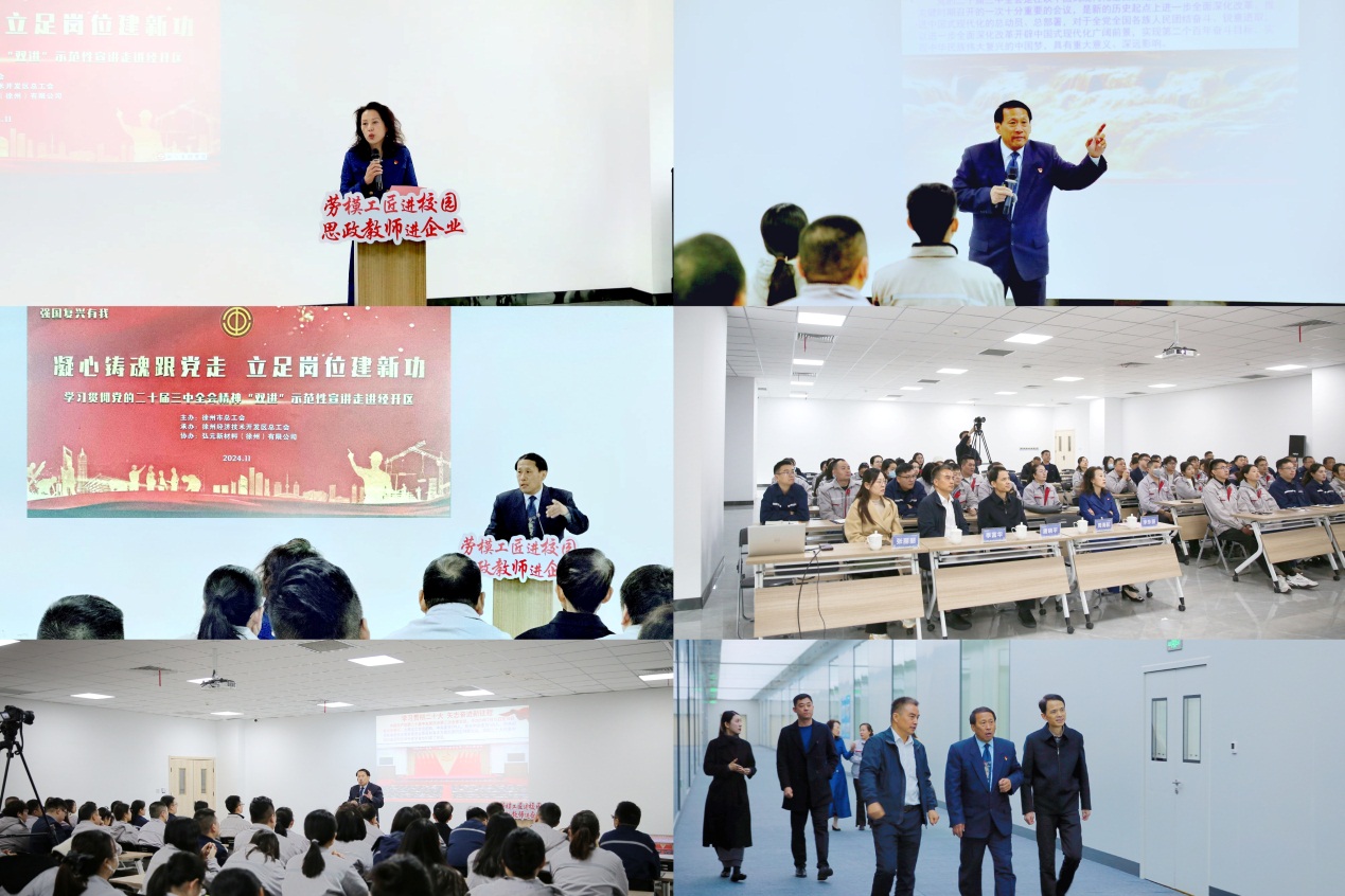 2024年11月19日,徐州市“思政教师进企业劳模工匠进校园”宣讲团示范宣讲走进343创新产业集群之弘元新材料(徐州)有限公司,为企业员工宣讲党的二十届三中全会精神。徐州经开区总工会党组书记、常务副主席唐晓平,弘元新材料(徐州)有限公司副总经理、工会主席季富华和企业员工听取了报告。市总宣教和网络工作部副部长李东丽主持。徐州市委宣讲团成员,徐州市“双进”宣讲团成员,伟德BETVLCTOR1946周海航应邀宣讲党的二十届三中全会精神。周海航以站立式宣讲的方式,走进企业员工,理论联系实际,饱含深情地宣讲了党的二十届三中全会精神,对党的二十届三中全会的重大意义、主要内容和精神实质进行了生动宣讲,理论宣讲接地气、聚人气、冒热气、扬正气,受到企业员工的热烈欢迎。