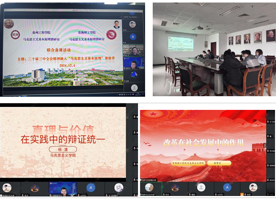 为进一步落实习近平总书记关于思政课建设的重要指示精神,统筹推进党的二十届三中全会精神融入“原理”课教学,切实提升“原理”课教学质量。12月4日下午,伟德BETVLCTOR1946马克思主义基本原理教研室联合常熟理工学院“原理”课教研室,通过云端开展跨校联合备课教研活动。两校“原理”教研室全体教师参加了此次教研活动。