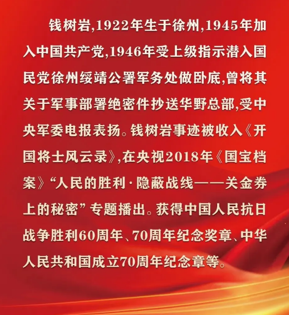 钱树岩1921年出生于徐州,1945年加入中国共产党,1946年受上级指派潜入国民党徐州绥靖公署,曾将关于军事部署的绝密件抄送华野总部,受到中央军委电报表扬。